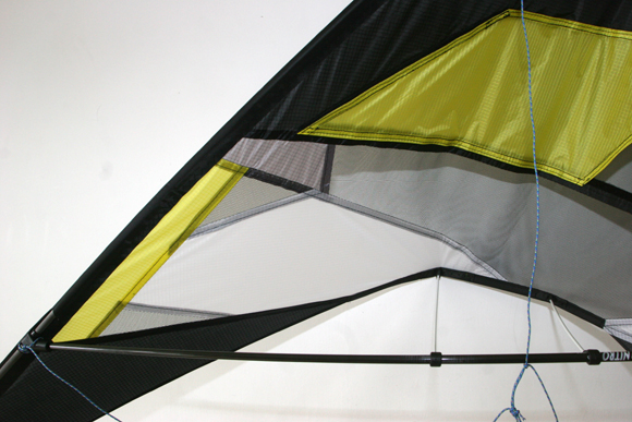 Compared with the V1, there's a much larger main vent panel and 2 additional mesh panels. The main panel has a rip-off so the amount of venting can be varied. With the rip-off in place the kite will fly in as little as 10 mph; remove the rip-off and the kite works up to 30+.